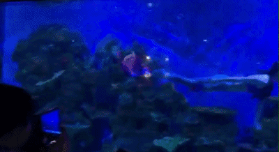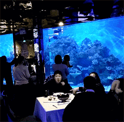 ▲餐廳里陳設著長30米的巨型魚缸,有恒溫28℃的海水,