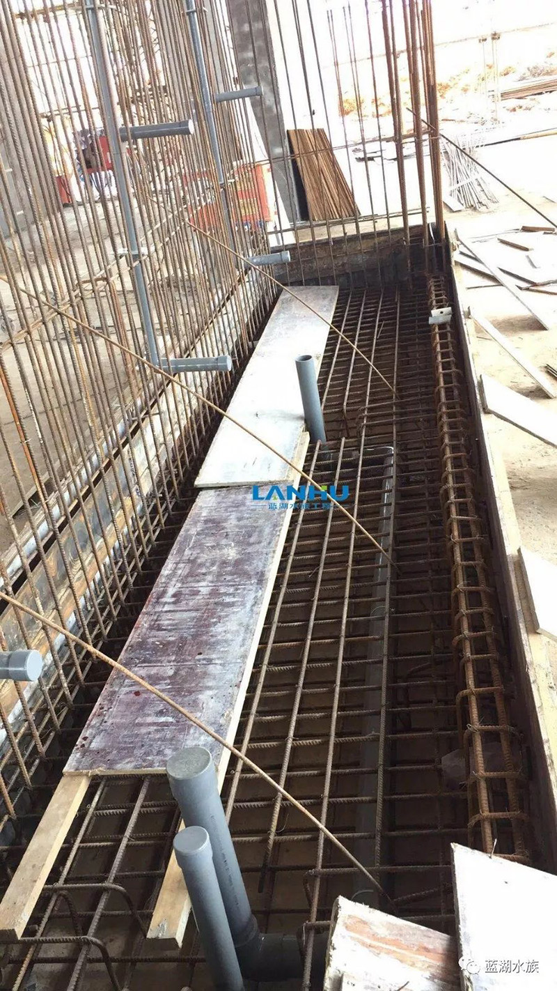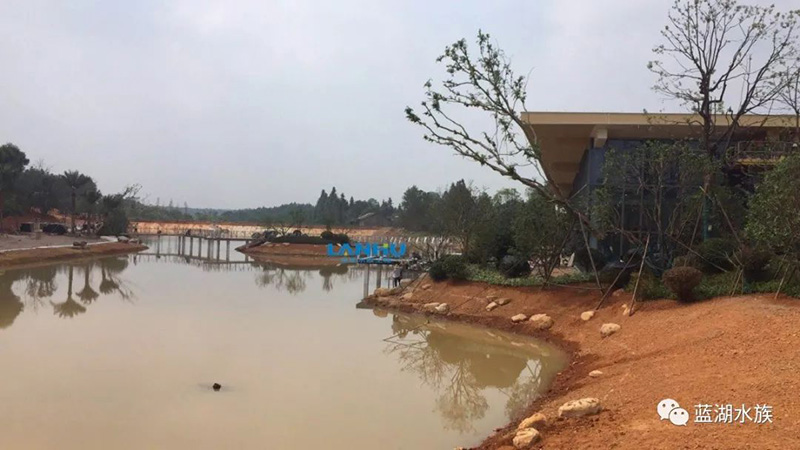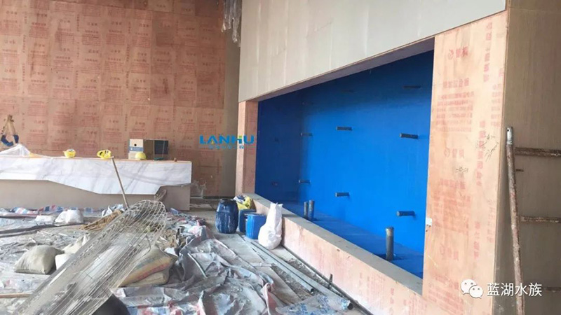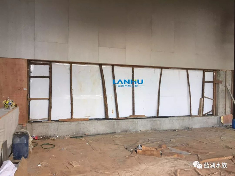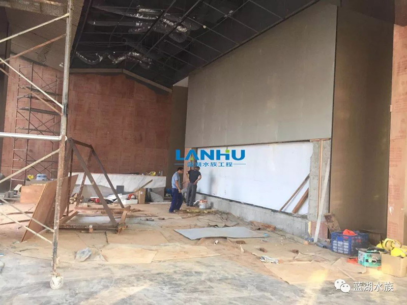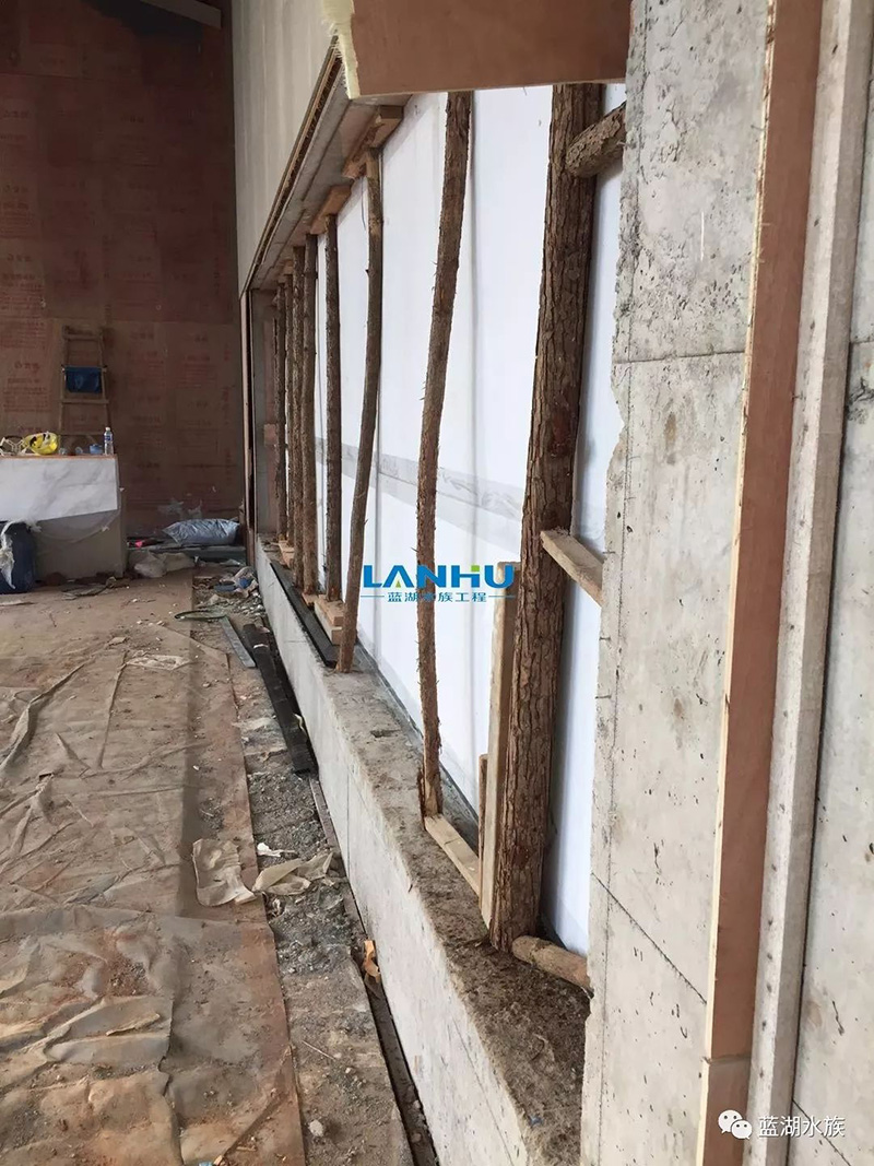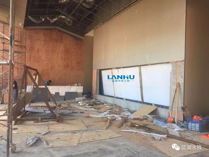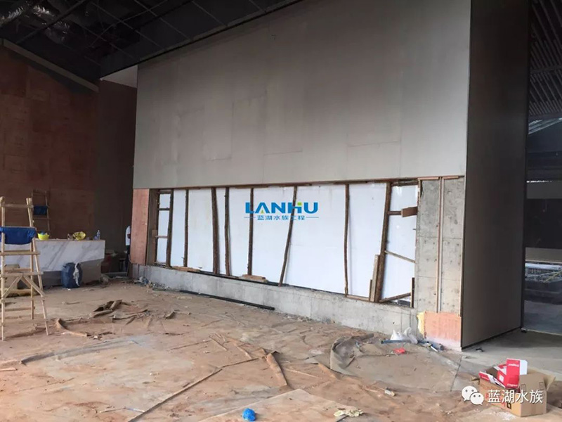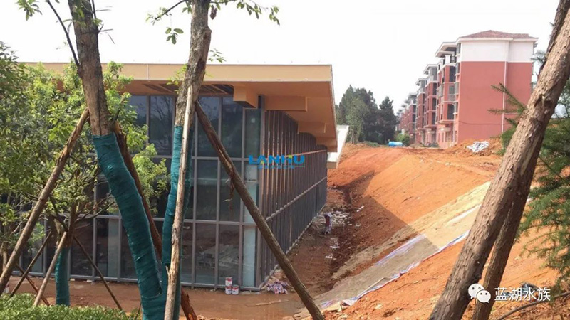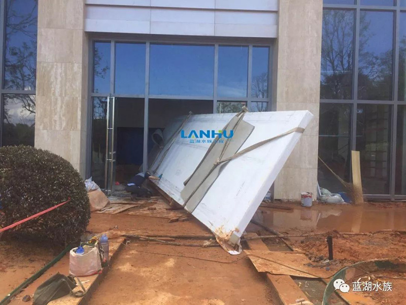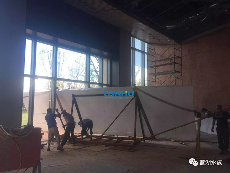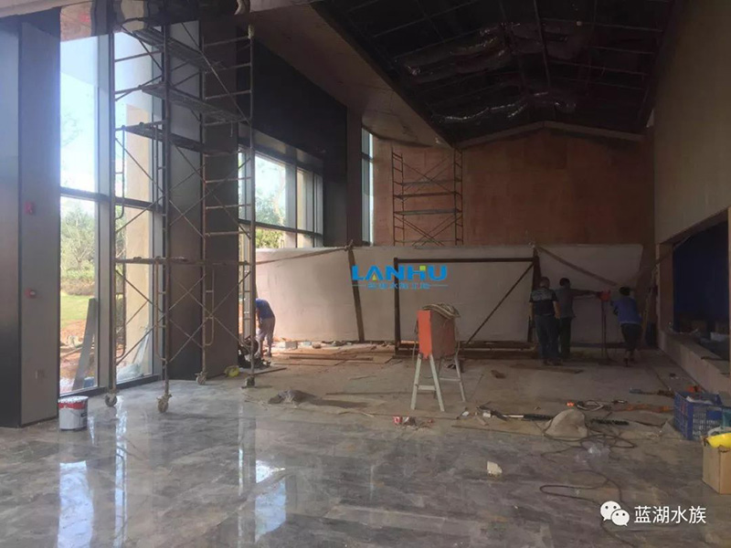源野山莊田園售樓部魚缸長8.2米 高2.5米 魚缸內徑寬1米。 采用120毫米厚亞克力板材制作.該項目的亞克力有機玻璃、LSS維生系統、燈光照明由上海藍湖水族工程有限公司承建