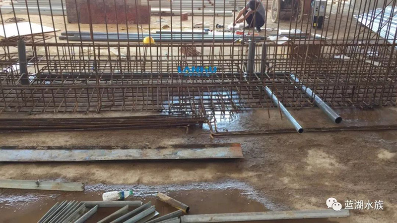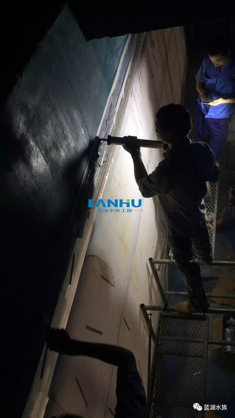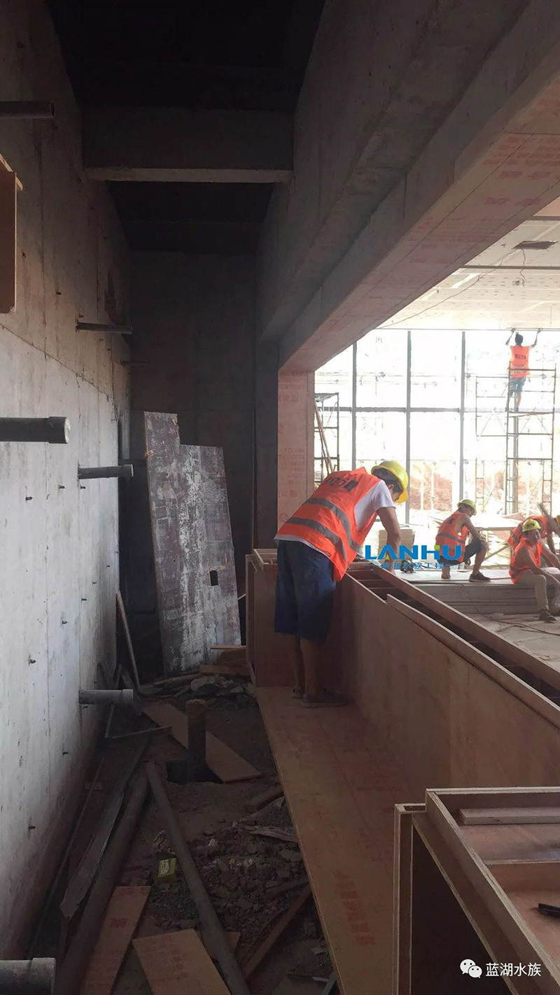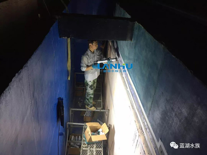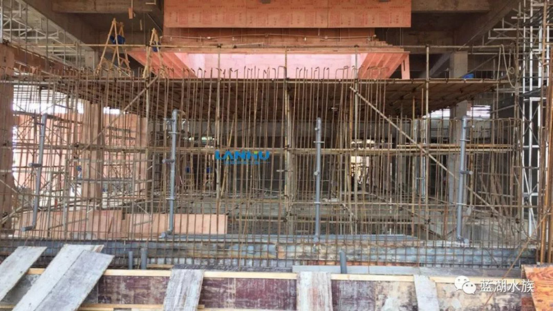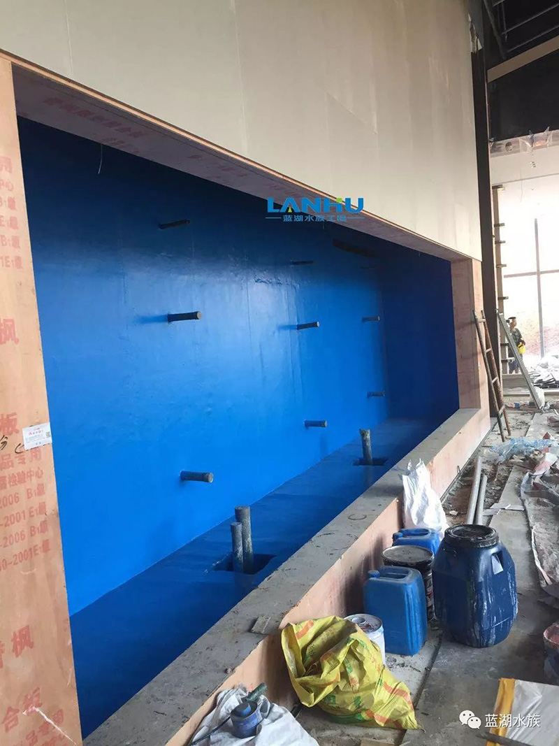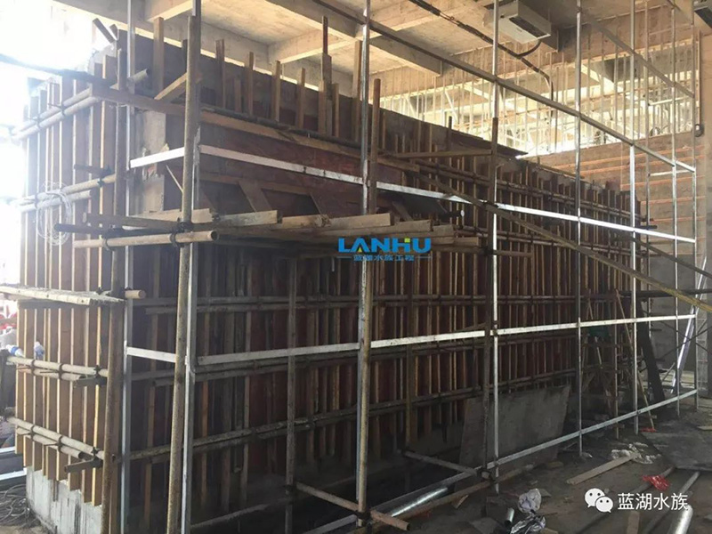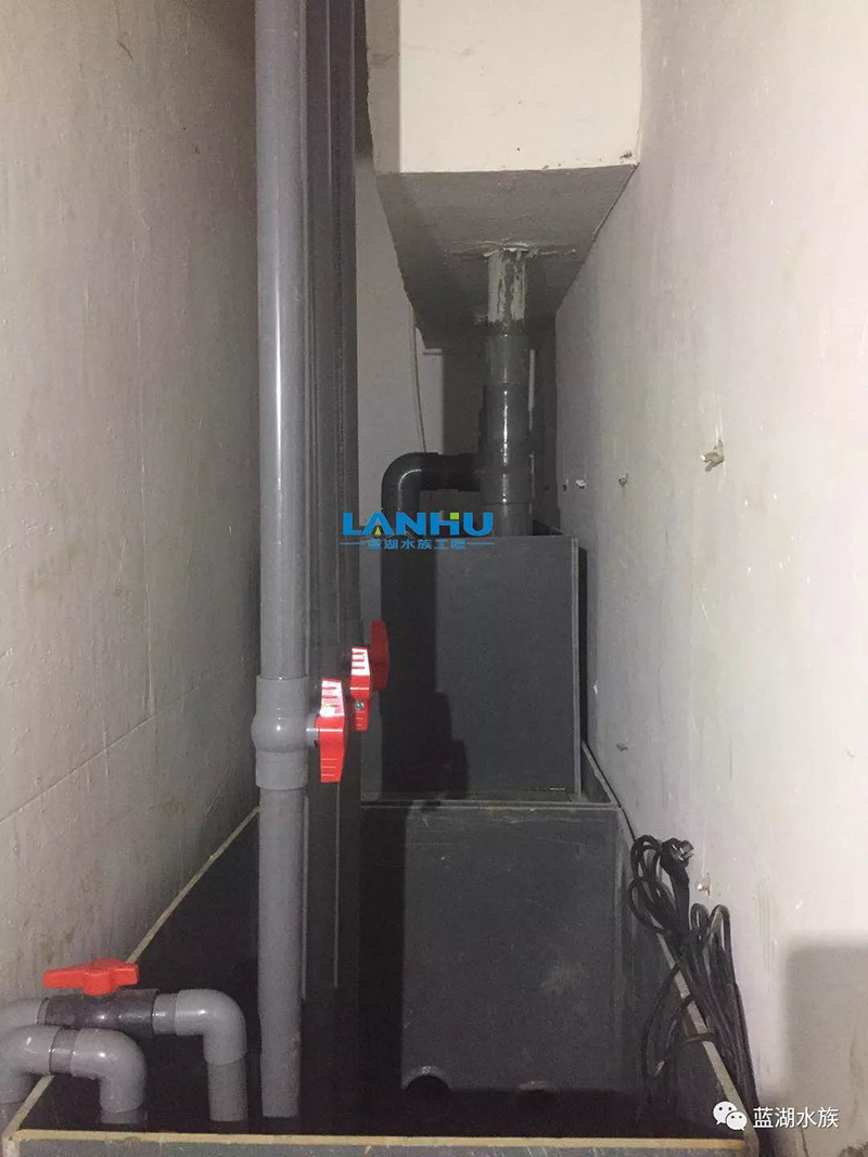 源野山莊田園售樓部魚缸長8.2米 高2.5米 魚缸內徑寬1米。 采用120毫米厚亞克力板材制作.該項目的亞克力有機玻璃、LSS維生系統、燈光照明由上海藍湖水族工程有限公司承建