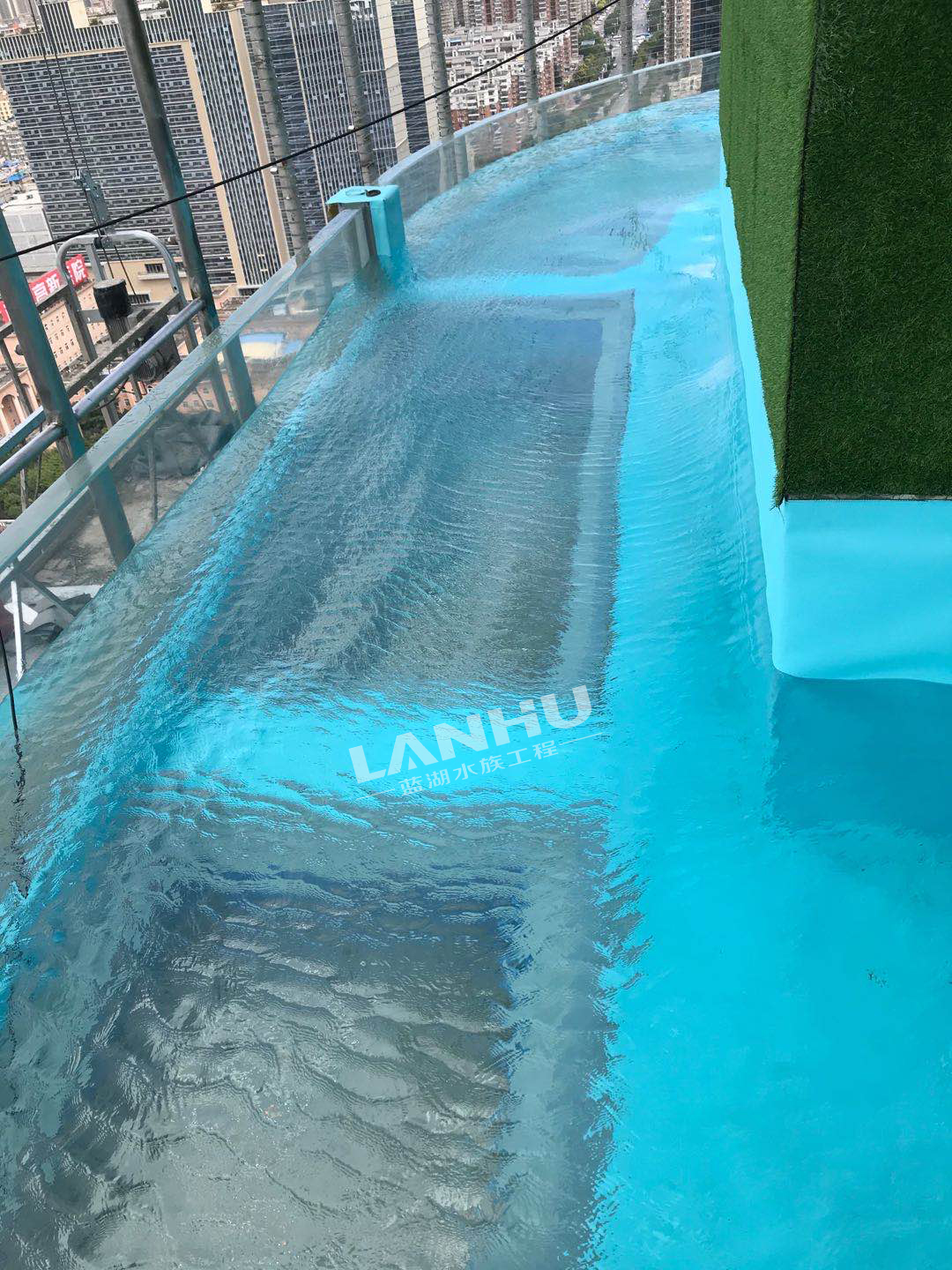 上海藍湖水族工程有限公司承接了該項目的亞克力板材(35米長側板+25米長底板。采用150mm亞克力板材)的供貨及安裝,以及泳池水處理系統。