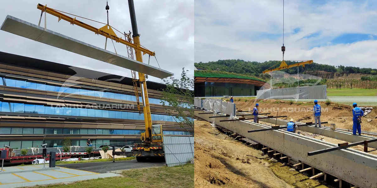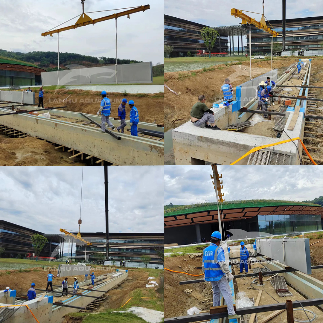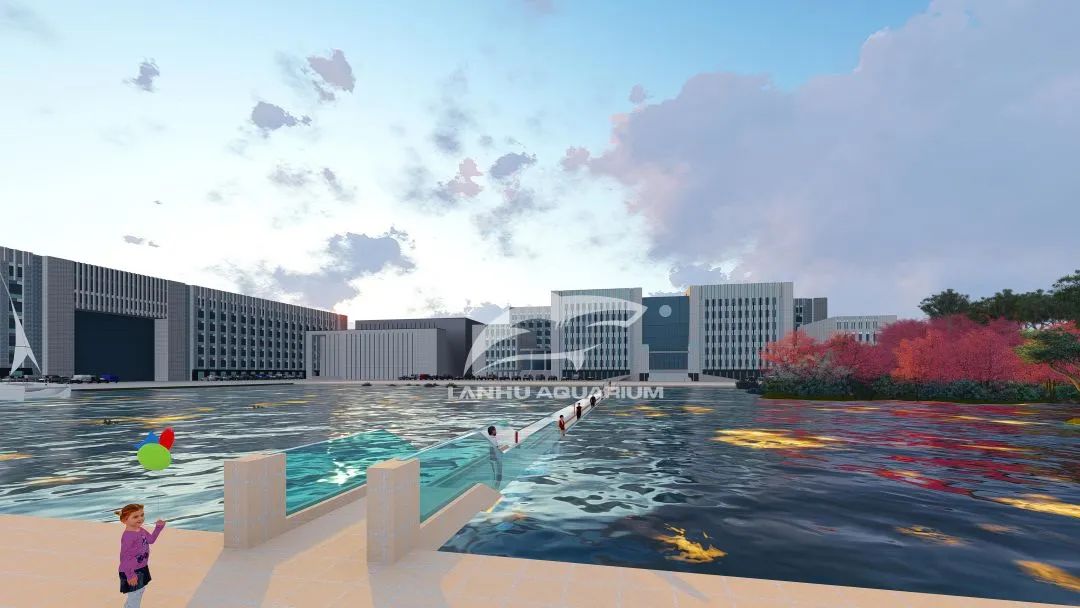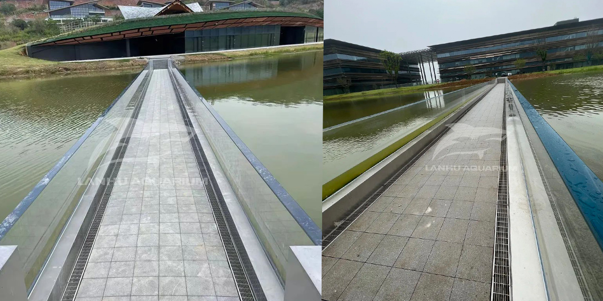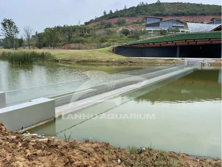 鳳棲湖亞克力棧橋是藍湖水族特別為溧陽科創基地規劃設計,景觀橋與鳳棲湖風景相得益彰。全透明的亞克力面板打造的橋梁增加游客觀賞美景的視野同時,其張力結構更展現出橋梁的力度美和結構美,全玻璃景觀橋與波光水面完美融合,當人們在橋上走過,就如同在水中漫步。