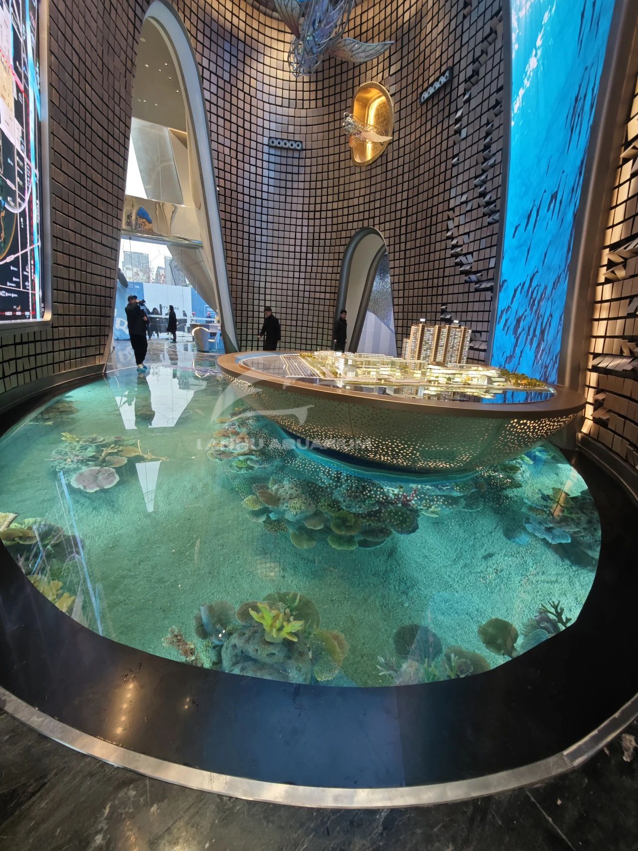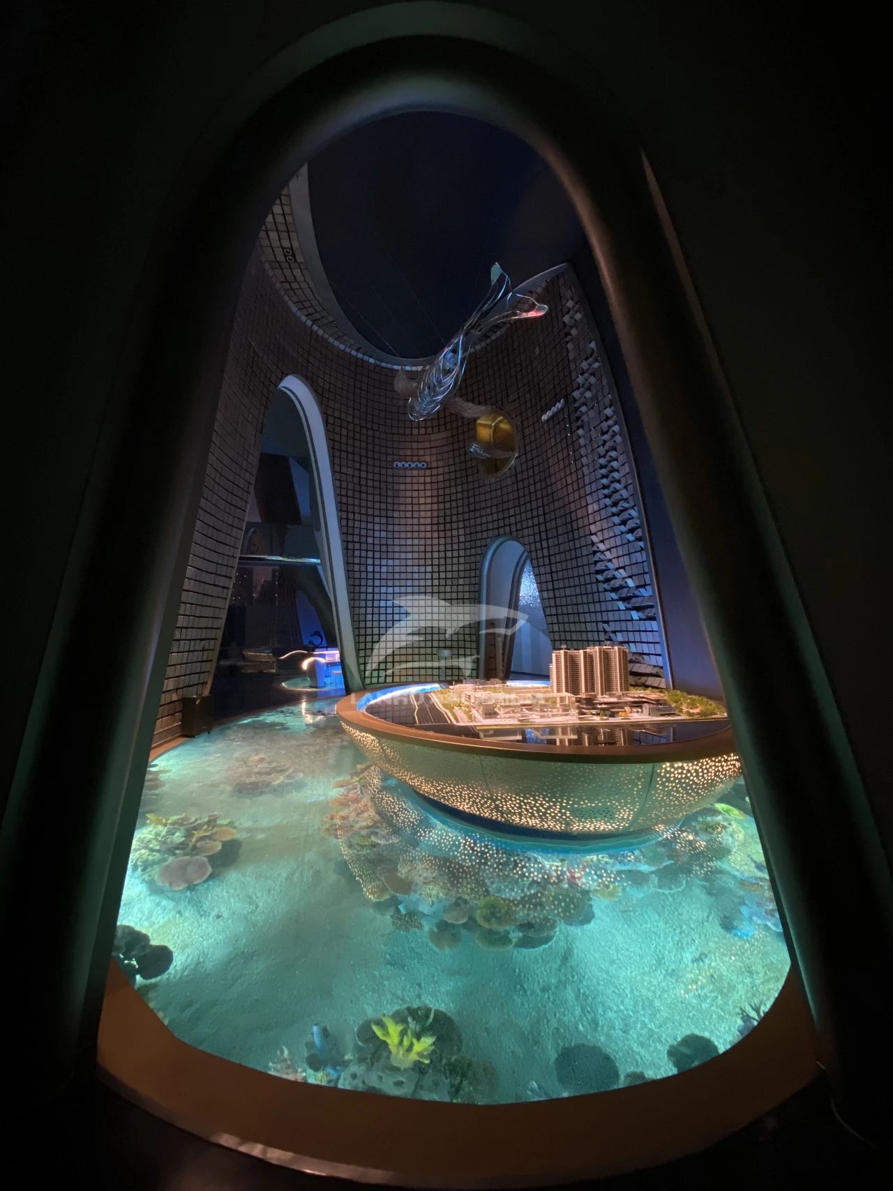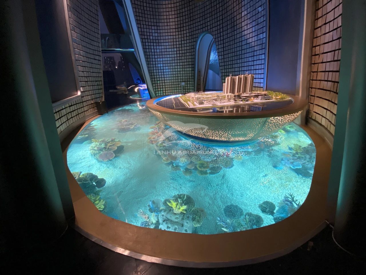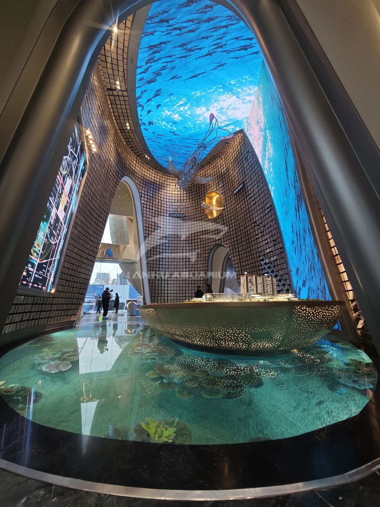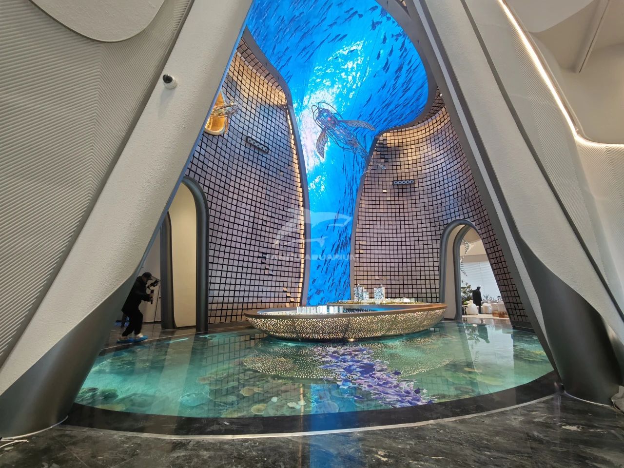 項目采用海洋度假生活方式的理念進行打造,整個售樓部猶如一個海洋館。透過亞克力材質地板欣賞到華麗多彩的海底奇境。十余種海洋魚類在水下珊瑚造景中游來游去,隨手一拍都是海洋館的既視感,讓整個室內仿佛圍繞一個巨大的水族箱,創造出前所未有的奇觀式體驗,