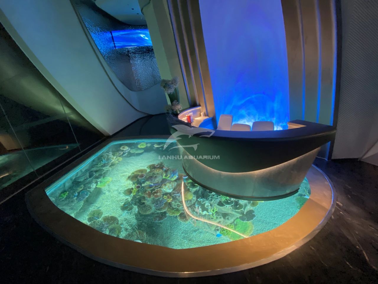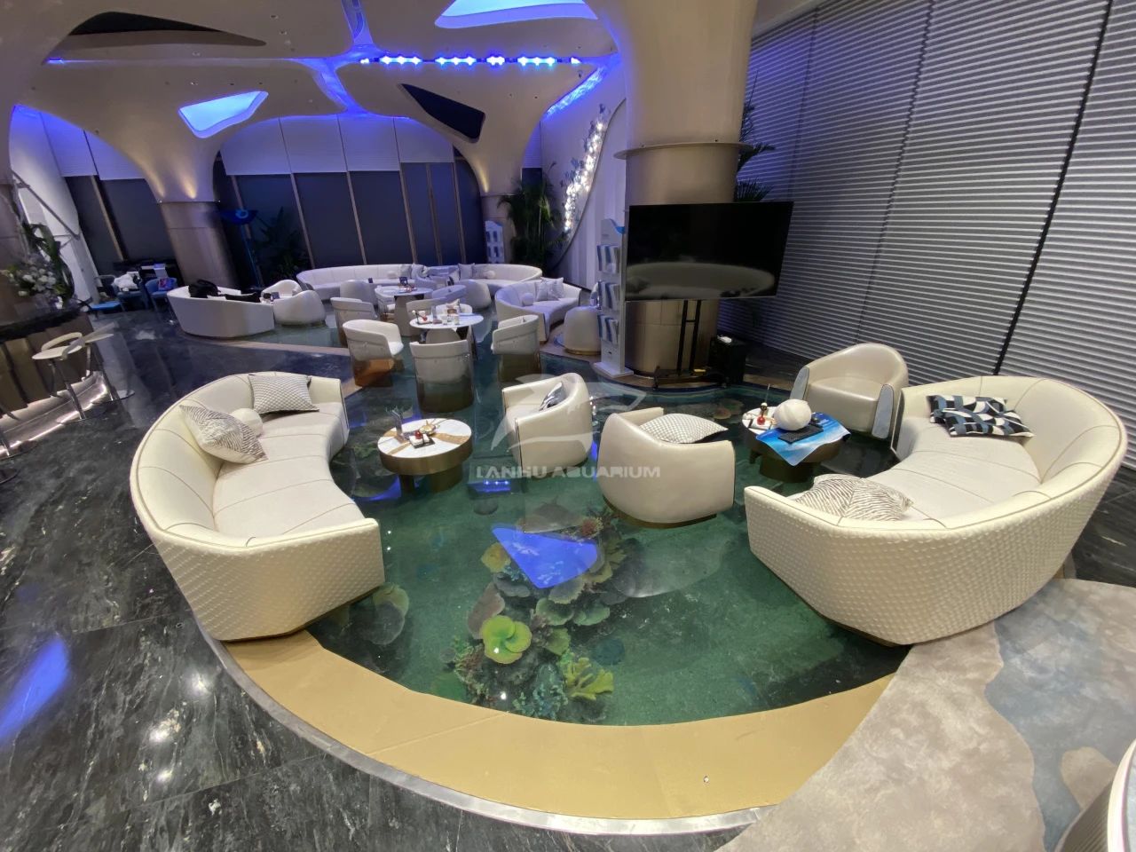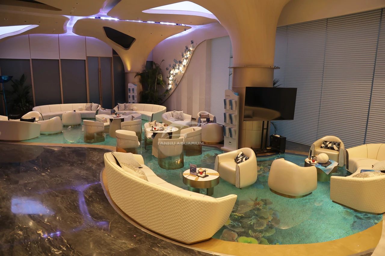 猶如海洋主題沉浸式空間,坐在沙發上,大型魚缸就在腳下,看著水流仿佛懸浮空中,光影在腳下透明亞克力折射下自帶夢幻濾鏡,各種熱帶魚在腳下穿梭。