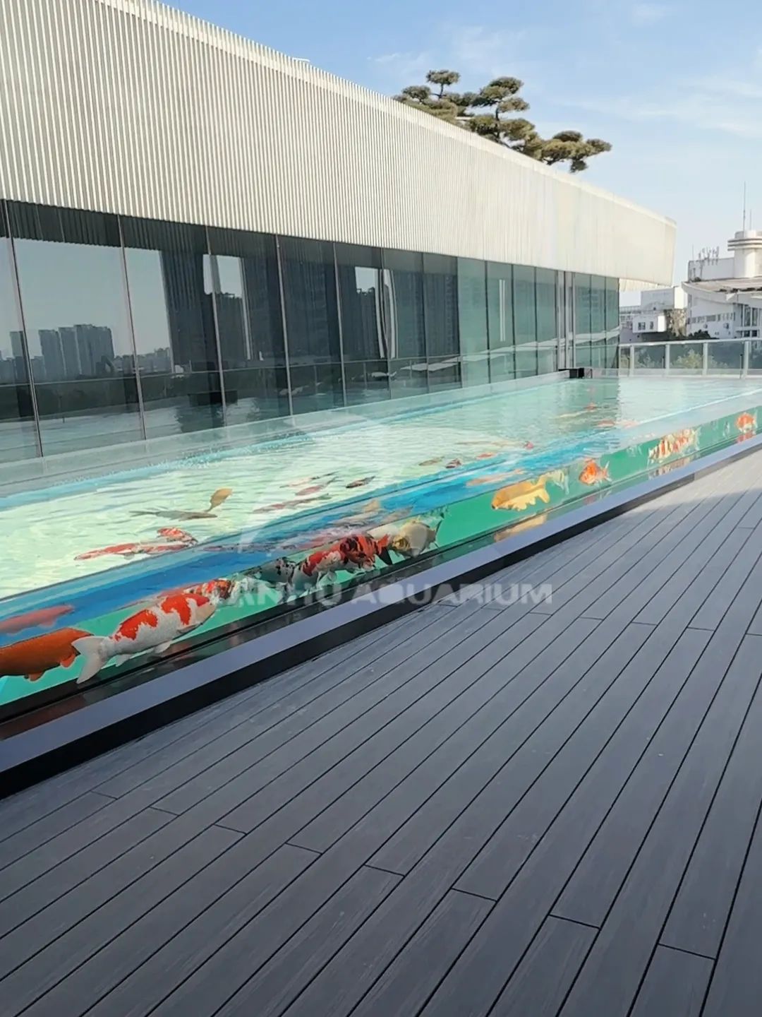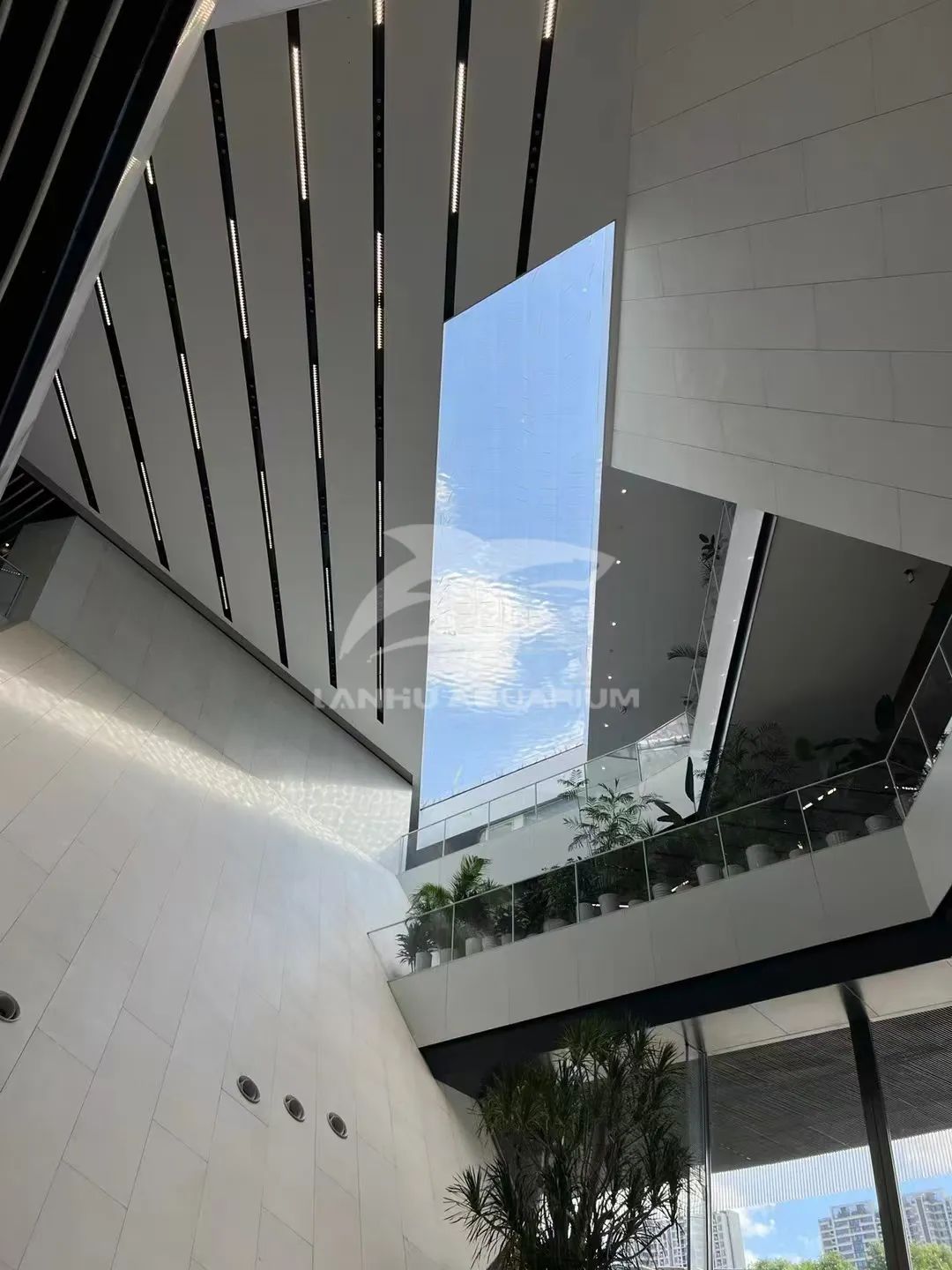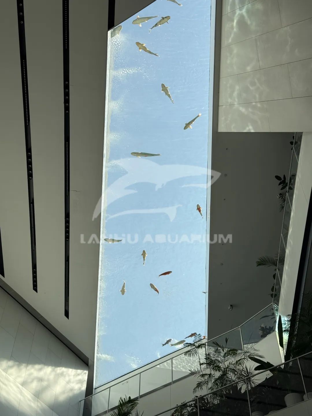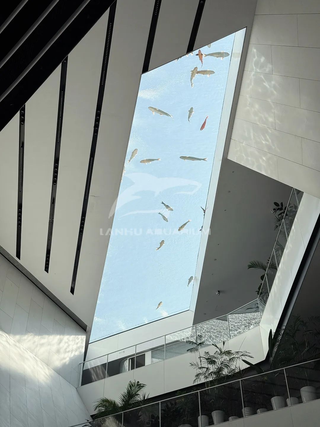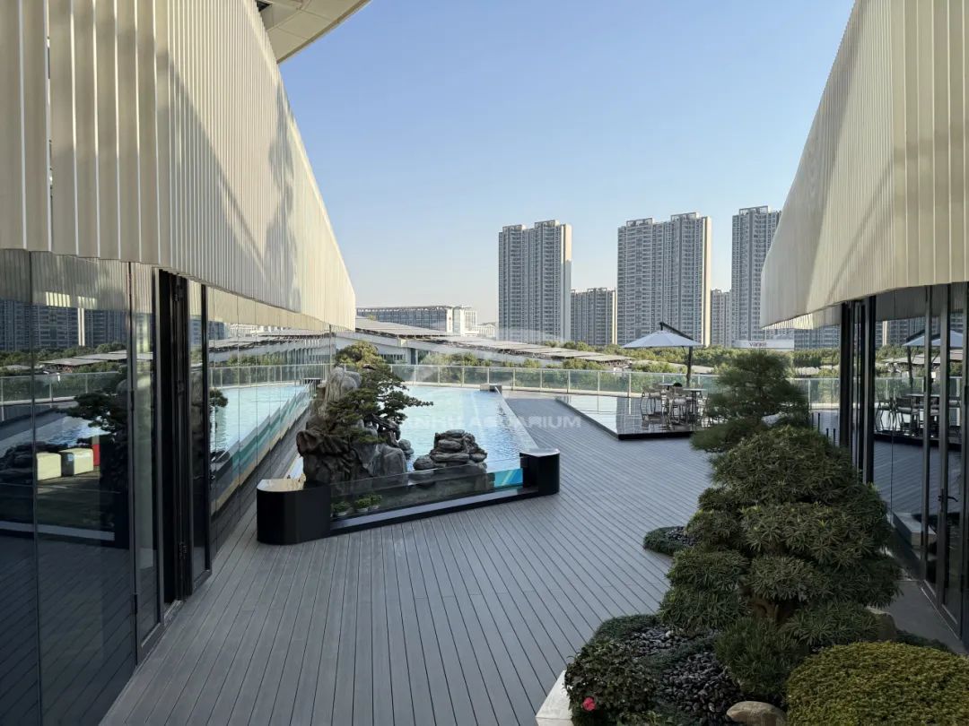 當你駐足當前抬頭仰望,天空上方亞克力筑造的透明魚池,魚兒在其中自由穿梭,這一刻建筑不再只是冰冷的建筑,而是自然與科技共融的沉浸式場所。