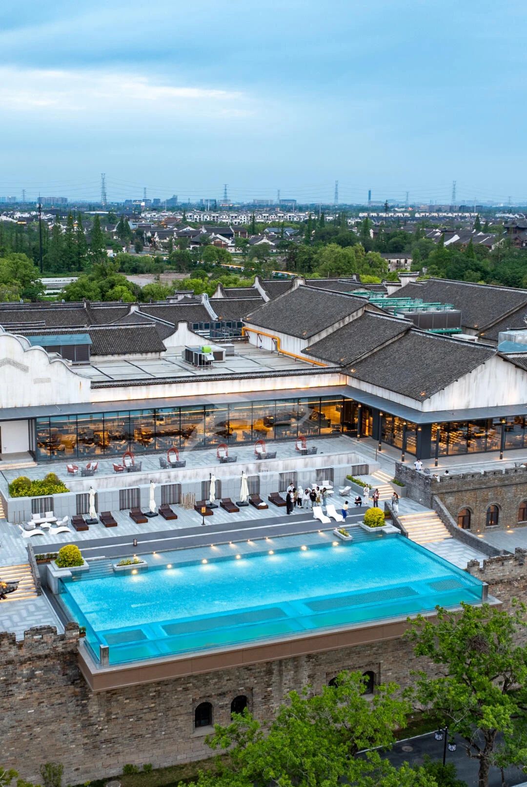 波光粼粼無邊透明泳池坐落在安靜的古城建筑中,更顯一股靜雅之感。